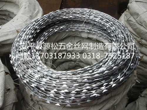 工藝:它采用鋼板(刀板)沖壓成型包附于熱鍍鋅鋼絲(芯線)之上,由銳利尖角鍍鋅鋼板或不銹鋼薄板做刀片,高張力鋼絲做芯線組合而成的。