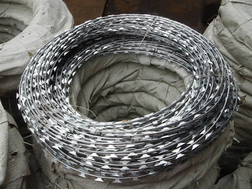 刀片刺網(wǎng)防護(hù)網(wǎng)(螺旋式刀片刺繩、直線型刀片刺繩、平板式刀片刺繩、刀片刺繩焊接網(wǎng))由銳利尖角鍍鋅鋼板或不銹鋼薄板做刀片,高張力鋼絲做芯線組合而成的阻絕器材。由于刺網(wǎng)造形獨(dú)特不易觸摸,因而能達(dá)到極好的防護(hù)隔離效果。