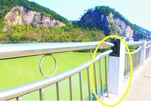 麗口市區(qū)溪口大橋上的很多不銹鋼護(hù)欄網(wǎng)損壞了遍體鱗傷。左右護(hù)欄共有88個(gè)圓環(huán)遭損壞,東西側(cè)護(hù)欄分別是11個(gè)和77個(gè)遭損壞。不銹鋼護(hù)欄上還有幾處彎曲、凹陷,應(yīng)該是碰撞后留下的痕跡。此外,在西側(cè)行車方向末端的護(hù)欄上,有一根石柱已經(jīng)不見(jiàn)了,只留下一個(gè)根部,露出鋼筋接頭。雖然都是一些小損壞,看似不影響行車和行人安全,但看著傷痕累累的大橋,總讓人感覺(jué)不是滋味。